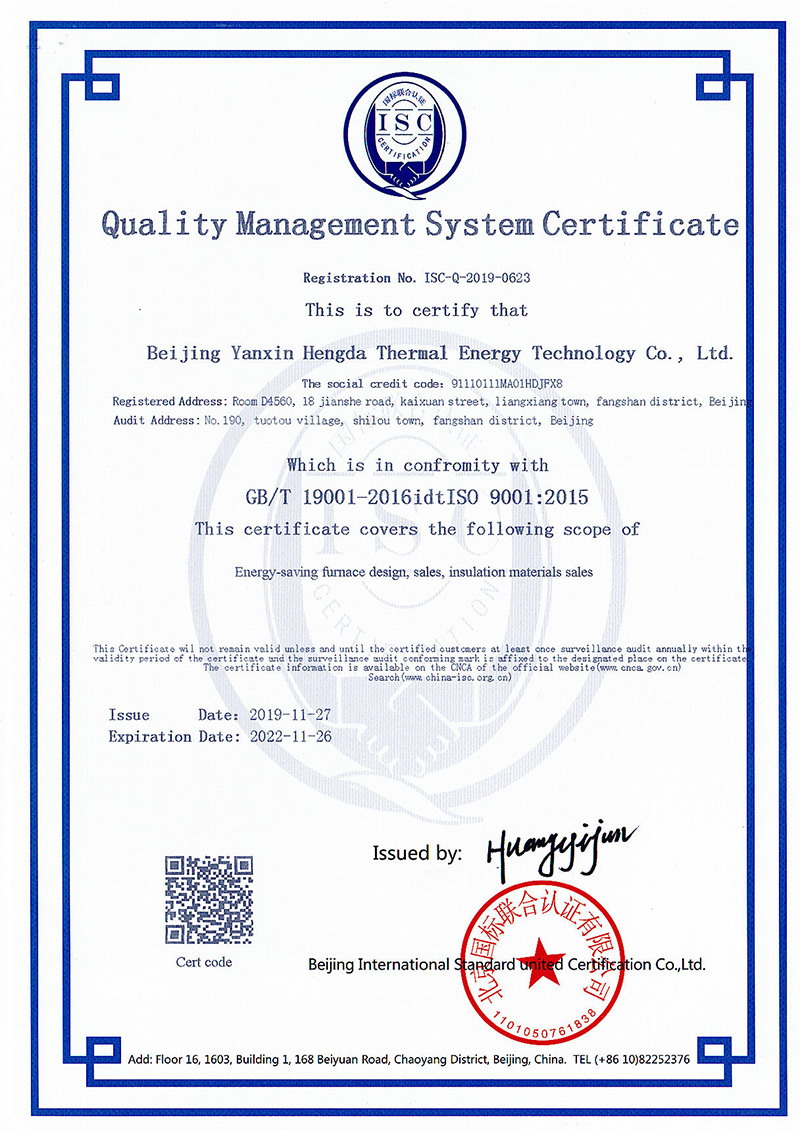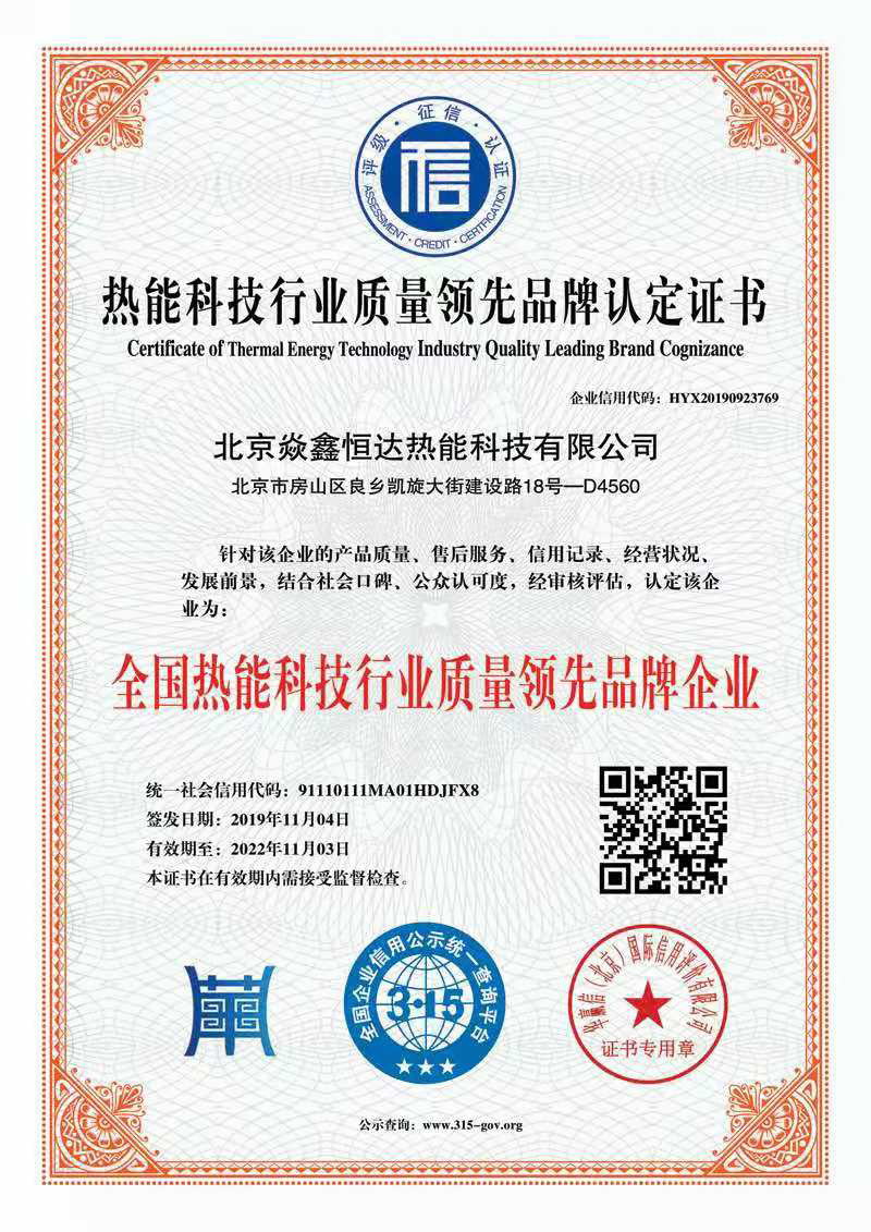北京焱鑫恒達(dá)熱能科技有限公司已通過(guò)ISO9001質(zhì)量認(rèn)證,并具備AAA級(jí)別(最高等級(jí))的企業(yè)信譽(yù)等級(jí)證書(shū)。擁有優(yōu)秀的設(shè)計(jì)制造團(tuán)隊(duì)和完善的售后服務(wù)隊(duì)伍,是一家具有合作優(yōu)勢(shì)的良好設(shè)備制造商。